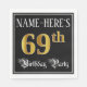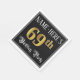 This elegant and ornate birthday-themed paper napkin design features a customisable name and the message “69th Birthday Party”. The large number “69th” has an imitation/faux gold-inspired colouring pattern, and the words “Birthday Party” are in opulent script-style text. The background is coloured black by default (although it can be customised). Opulent, luxurious paper napkins like this might be useful at a birthday party being held to honour somebody’s sixty ninth birthday. [~Z0000565]