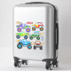 Six cool monster trucks in various colours for kids with flames and personalised blue, red and white names.