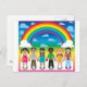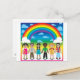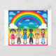 Illustration of 6 happy kids under a rainbow with a colourful background and a place for text or imagery.