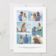 This elegant wedding design features a vertical photo of the couple softened with a white screen to highlight the text overlay. The left-hand edge features a navy blue watercolor agate border trimmed with faux gold glitter. The customisable black text combines handwriting, copperplate and italic fonts. The reverse side provides spaces for 5 additional photos (3 horizontal 1 square and 1 vertical) and room for your wedding website URL or other brief message.