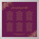 This 6 table seating chart is both simple and elegant with gold text on a magenta or cassis purple coloured background and lacy floral filigree in the corners. The title reads "please find your table" in an elegant script calligraphy. Sophisticated and chic. Includes table assignments for 60 guests with 10 seats per table.