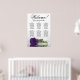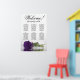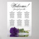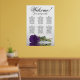This beautiful wedding seating chart has six tables, each accommodating 10 guests, totalling 60 guests. The chart features a romantic design, showcasing a single long-stemmed deep royal purple rose delicately resting on its side and reflecting in a serene pool of water. The chart's title, rendered in elegant script calligraphy, warmly invites guests with "Welcome! Please find your table," while leaving sufficient space at the bottom for the couple's names and wedding date. This seating chart serves as a wonderful and practical way to greet your guests and assist them in finding their designated seats at the reception, exuding an air of charm and sophistication.