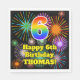 This exciting and fun birthday paper napkin design features a large number “6” with a colourful rainbow spectrum gradient inspired pattern, along with the message “Happy 6th Birthday,”, and a personalised name. The background features a vibrant and colourful pattern inspired by the appearance of bursting celebratory fireworks. Colourful paper napkins like this might be used when hosting a party for somebody in celebration of their 6th birthday. [~Z0000574]