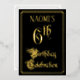 The front of this luxurious, ornate, foil sixth birthday celebration/party invitation design features the message “6th Birthday Celebration” in opulent script-style text. It also has a customisable name. The background of the front is coloured black by default (although it can be customised to a different colour). The back features personalised details about the event, such as the date, time, location, and any other information that may be relevant. Elegant, fancy, customised invitations like these might be used to invite guests to a birthday party/celebration being held to honour somebody’s sixth birthday. [~Z0000589]