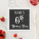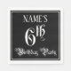 This elaborate and opulent birthday-themed paper napkin design features a personalized name and the message “6th Birthday Party”. The large number “6th” and the words “Birthday Party” are in fancy script-style text. The background is colored black by default (although it can be customized). Fancy, elaborate paper napkins like this might be used at a birthday celebration being held to honor somebody’s sixth birthday. [~Z0000563]