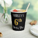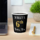 This elegant and fancy birthday paper cup design features a customisable name and the message “6th Birthday Party”. The large number “6th” has an imitation/faux gold-inspired colouring pattern, the words “Birthday Party” are in luxurious script-style text, and the background is coloured black by default (although it can be customised). Luxurious, ornate paper cups like this might be used at a birthday celebration being held in celebration of somebody’s sixth birthday. [~Z0000567]