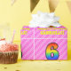 This upbeat and festive 6th birthday-themed wrapping paper design features a large number "6" having a colourful pattern inspired by the look of a rainbow spectrum. It also features the message "Happy 6th Birthday,", and a personalised name. The background features a pattern of dark pink and light pink stripes containing loving pink heart shapes. Birthday themed wrapping paper like this might be a fun way to wrap a gift or present being given to celebrate somebody’s sixth birthday. [~Z0000415]