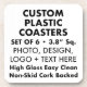 Custom personalised Set of 6 high gloss easy clean Plastic Coasters, 3.8" square, with non-skid cork backing. Make, create your own personalised PLASTIC COASTERS. Upload your own logo, design, photo, image plus add text.