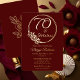 Elegant typography design "70 and Fabulous" 70th birthday party design featuring a rose outline circular frame. Back features a rose outline in gold tone (not gold foil). Front and back background is a dark red burgundy colour.