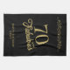 70 and Fabulous Elegant Ornament 70th Birthday Black kitchen towel. 70 and fabulous saying in trendy golden script and a gold ornament. Personalise it with your name and the age.