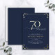 This beautiful invitation features hand lettered calligraphy artfully presenting 'seventy' in luxurious hand lettering against a blue background, adorned with delicate swirls in the corners top and bottom in real gold foil, along with the name and the number 70. This image will have all your guests excitedly anticipating your fabulous seventieth festivities!