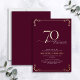 This beautiful invitation features hand lettered calligraphy artfully presenting 'seventy' in luxurious hand lettering against a burgundy background, adorned with delicate swirls in the corners top and bottom in real gold foil, along with the name and the number 70. This image will have all your guests excitedly anticipating your fabulous seventieth festivities!