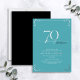 This beautiful invitation features hand lettered calligraphy artfully presenting 'seventy' in luxurious hand lettering against a turquoise background, adorned with delicate swirls in the corners top and bottom in real silver foil, along with the name and the number 70. This image will have all your guests excitedly anticipating your fabulous seventieth festivities!