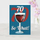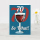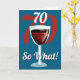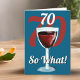 70 so what motivational and funny 70th birthday card. The design has a red wine glass with an age number above and the background is the age in red colour. Text 70 So what is motivational, positive and funny, and is perfect for a person with a sense of humour. You can change the age with any other age. Great for a woman or a man who celebrates the seventieth birthday.