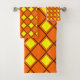 This towel set has a 1970s design of solid yellow diamonds inside brown diamond outlines on a field of orange.