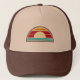 A hat featuring a semi circle shaped 70s inspired illustration of a beach sunset. Look for matching items at Jill's Paperie.