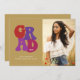 This fun graduation invitation has a modern take on vintage 1970s design. The front of the card includes 70s lettering on the left and a vertical photo on the right. The retro typography reads "Grad" in shades of cherry, plum, blackberry, and raspberry against a gold background. The graduate's name and school are written below the typography, and the graduation year is written across the D in "Grad". On the back, there is a template for graduation party details.