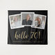 This custom 70th birthday tapestry features a collage of three custom square photos above the phrase "hello 70!" in elegant gold-coloured calligraphy script and sans serif font on a black background. Add the guest of honour's name and birthday below. A great way to celebrate someone who's turning seventy!