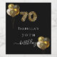 For an elegant 70th birthday party. A black background, decorated with balloons. Number 70 is written with a trendy balloon style font, leopard pattern. Personalise and add a name and a date. The word birthday is written with a modern hand lettered style script with swashes.