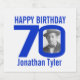 70th birthday white text on blue photo party paper beer or wine labels. Great to add a personal touch to a surprise seventieth birthday party or to put on your party tables. Personalise with your birthday boys photo in the 0 of 70 and personalise with your choice of name. Other matching items are available. Designed by www.mylittleeden.com