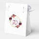 Front and back: A chic white background with a faux gold geometric frame. Decorated with dark purple and burgundy flowers, roses and boho style feathers. The name is written with pink hand lettered style script. The date is written with black numers and age 70 in burgundy.
