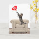 Tabby cat standing on a leather chair playing with a red heart balloon for 70th birthday.