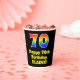 This fun and colourful birthday-themed paper cup design features a large number “70” having a rainbow spectrum gradient inspired pattern. It also features the message “Happy 70th Birthday,”, and a custom name. The background is coloured black. Colourful, vibrant paper cups like this might be fun to have at a birthday party being held in celebration of somebody’s 70th birthday. [~Z0000537]