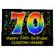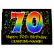 This fun, vibrant, and colourful birthday-themed gift bag design features a large number "70" with a rainbow spectrum gradient inspired pattern, along with the message "Happy 70th Birthday,", and a customisable name. Part of the background features a colourful music notes and symbols pattern. A gift bag like this might be used when giving a gift or present in honour of somebody’s seventieth birthday. [~Z0000425]
