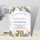 For a 70th birthday party. A white background decorated with eucalyptus greenery and golden leaves. Golden faux glitter spots. Personalise and add your names and wedding details. Black and golden coloured letters. Number 70 is written with balloon style font.