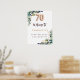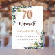 A chic white background. Decorated with green watercolored eucalyptus leaves, sprigs, greenery, faux gold leaves. Personalise and add the name. Black and golden letters. Number 70 is written with a balloon style font.