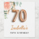 For an elegant and feminine 70th birthday birthday party. A chic white background. Decorated with a rose gold and blush pink watercolored rose flower, floral, green eucalyptus leaves, sprigs, greenery and faux gold sprigs. Personalise and a name. Black and golden letters. The name is written with a modern hand lettered style script. Number 70 is written with a golden balloon style font.