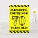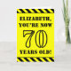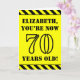 The front of this bold and attention-grabbing birthday themed greeting card design features a custom name and the message "YOU’RE NOW 70 YEARS OLD!" in black stencil style text on a yellow coloured background. The front also features an eye-catching yellow and black stripes pattern at the top and bottom edges. The inside features an editable birthday greeting message, or could perhaps be cleared and left blank if a message is to be written by hand instead. A personalised birthday card like this might be a fun way to send a message in celebration of somebody’s seventieth birthday. [~Z0000413]