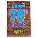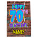 The front of this fun birthday-themed gift bag design features the message “HAPPY 70TH BIRTHDAY,” having a colourful, vibrant, urban street art and graffiti inspired appearance, plus a personalised recipient name. The background features a pattern inspired by the look of a brick wall. A giftbag like this might be used when giving a gift or present in honour of somebody’s 70th birthday. [~Z0000536]