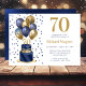 This fabulous men's 70th birthday party invitation featuring a 2-layer navy blue and gold cake with navy blue and gold balloons, the number 70 in gold and shiny blue confetti would be perfect for celebrating your husband, brother, dad, friend, co-worker. It is traditional and classic while being fresh, modern and contemporary. The back is a coordinating navy blue foil.