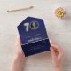A navy blue background. The blue colour is uneven. Personalise and add a photo, name, party details, RSVP date, return address and name. Number 70 is written with a balloon style font in faux silver.