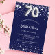 A modern, stylish and glamourous invitation for a 70th birthday party. A navy blue background, decorated with faux silver stars. Personalise and add your name and party details. Number 70 is written with a balloon style font.