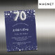 A modern, stylish and glamourous magnetic invitation for a 70th birthday party. A navy blue background, decorated with faux silver stars. Personalise and add your name and party details. Number 70 is written with a balloon style font.