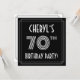 The front of this luxurious seventieth birthday party/celebration invitation card design features an editable name, an intricate art deco look inspired number “70th”, the message “BIRTHDAY PARTY!”, and a border pattern consisting of lines. The background of the front is coloured black by default, but it can be customised to a different colour if desired. The back features personalised details about the event, such as the date, time, location, and any other information that may be important. Elegant, stylish, personalised invitations like these might be used to invite guests to a birthday party/gathering being held to celebrate somebody’s 70th birthday. [~Z0000615]