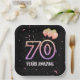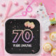 Party balloons and confetti on black background with the neon number 70 for a 70th birthday party.