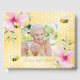 For a 70th summer birthday party. Yellow, white background with a honeycomb pattern. Decorated with pink coloured tropical florals flowers, hibiscus and happy bumble bees. Add your own photo and the age 70. Green coloured letters.