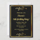 A trendy, modern 70th birthday party invitation card for both men and women. A classic black background, with faux gold coloured letters. Templates for your information. Faux gold decor with floral swirls and a golden frame.