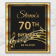 A wine or sparkling wine bottle label for an elegant black and gold themed 70th birthday party. Templates for a name, age, and date of the party. Golden coloured letters. Black background colour and a faux gold frame and golden music notes. You can change the background colour to match your theme. Click customise and then "select a background colour" on your right.