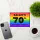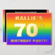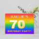 The front of this exciting seventieth birthday celebration foil invitation card design features an editable name, a large number “70th”, the message “BIRTHDAY PARTY!”, and a border. The background of the front has a fun, multicolored, rainbow spectrum inspired gradient pattern. The back features personalized details about the event, such as the date, time, location/venue, and any other information that may be useful. Personalized invitations like these might be a fun way to invite guests/attendees to a birthday party/gathering being held to celebrate somebody’s 70th birthday. [~Z0000599]