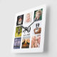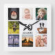 A wall clock as a gift for a 70th birthday for a guy, celebrating his life with a collage of 8 of your own photos. Templates for a name, age 70 and a date. Date of birth or the date of the anniversary. Black coloured letters. White background.
