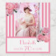 A label for a fun 70th birthday party. Classic slim pink and white vertical stripes as background. With girly and feminine flowers, pink roses and peonies as decoration.