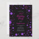 A black 70th birthday party invitation featuring a purple and deep pink faux glitter confetti border consisting of spots and stars for a subtle shimmer rather than a big sparkle creating a more glamourous style for the invitation.