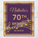 A wine or sparkling wine bottle label for an elegant purple and gold themed 70th birthday party. Templates for a name, age, and date of the party. Golden coloured letters. Purple background colour and a faux gold frame and golden music notes. You can change the background colour to match your theme. Click customise and then "select a background colour" on your right.
