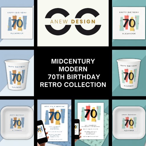 Mark a fabulous 70th birthday in true retro style with these midcentury modern party napkins! Inspired by the colourful atomic-era aesthetic, this design features bold geometric shapes and playful pops of colour around a cheerful ‘Happy Birthday’ greeting. Perfect for both men and women, these napkins add a stylish vintage touch to your table décor. Personalise with the guest of honour’s name to make their milestone celebration uniquely theirs!