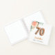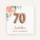 For an elegant and feminine 70th birthday party. A chic white background. Decorated with a rose gold and blush pink watercolored rose flower, floral, green eucalyptus leaves, sprigs, greenery and faux gold sprigs. Personalise and a name. Black and golden letters. The name is written with a modern hand lettered style script. Number 70 is written with a golden balloon style font. Can be used as a guest book or for planning the party.