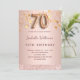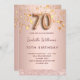 A modern, stylish and glamourous invitation for a 70th birthday party. A faux rose gold metallic looking background with faux gold dripping stars. The name is written with a modern dark rose gold coloured hand lettered style script. Personalise and add your party details. Number 70 is written with a balloon style font, script.